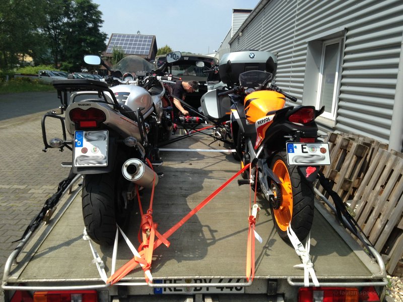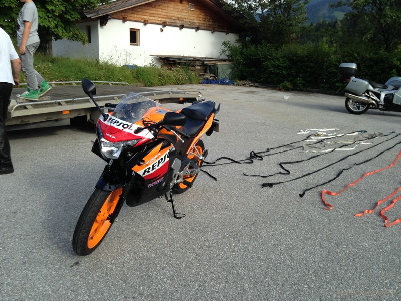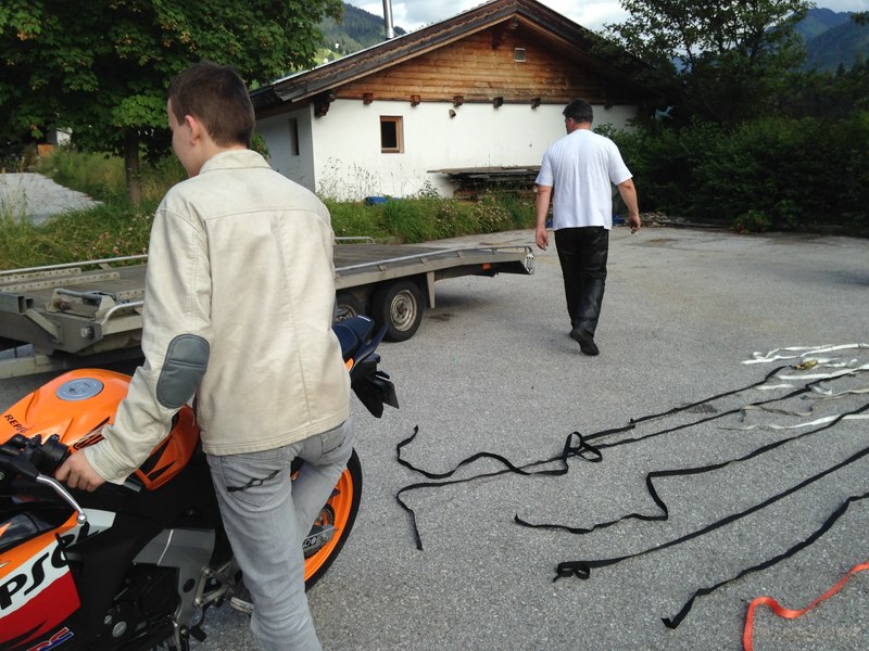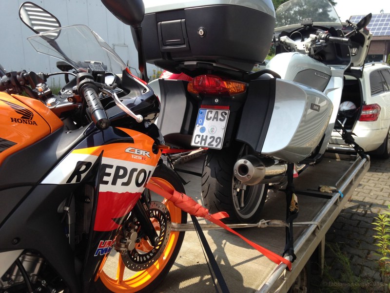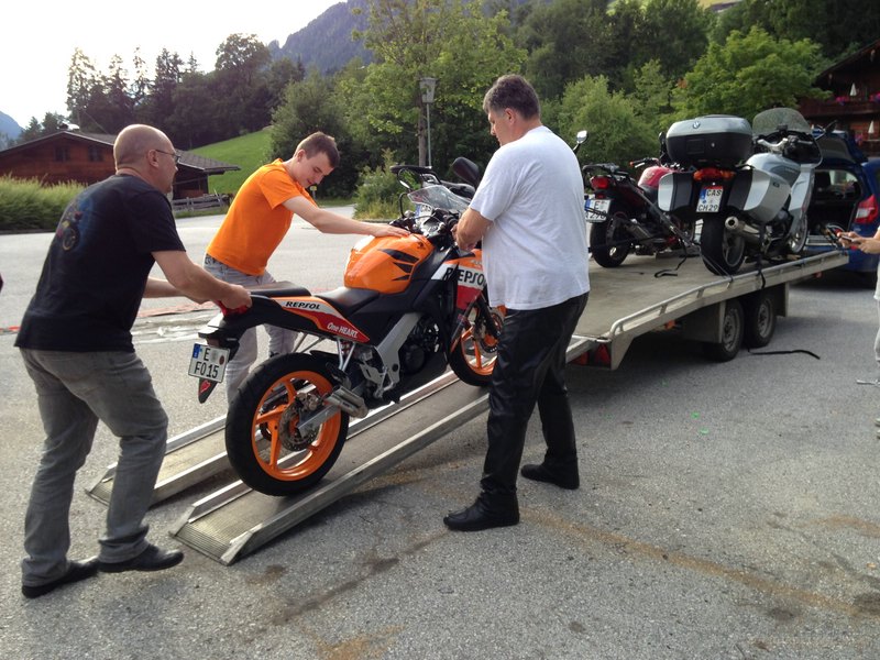 Schade, der Urlaub verging ja wie im Flug, da mussten wir die Motorräder für die Heimfahrt wieder aufladen. Es war ein toller Urlaub. Sven und ich hatten viel Spass zusammen. Am meisten Spass hat das Motorradfahren gemacht, ich denke heute noch öfters an die schönen Kurven, Pässe und die schöne Aussicht in den Bergen. Wenn alles alles klappt, wollen wir es nächstes Jahr wieder machen. Darauf freue ich mich schon. Das war's, ich hoffe, es hat euch gefallen, euer Webmaster Fabian.